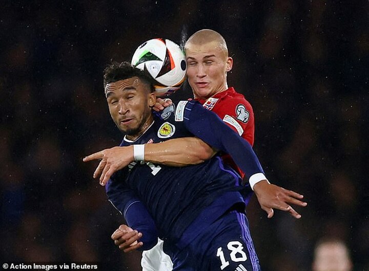 The Everton youngster was given his chance after an injury to Aaron Hickey. But he was too slow to close down Donnum as he curled high into the Scotland net. But made a magnificent block to stop Donnum grabbing a second