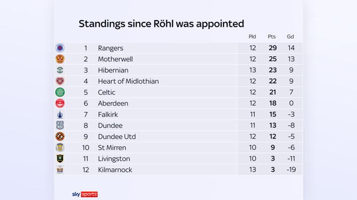 Rangers were eight points behind Celtic and 13 off leaders Hearts when Röhl was appointed. If they beat Aberdeen on Tuesday night, live on Sky Sports, they will move three points ahead of their Old Firm rivals and to within three of the Jambos.