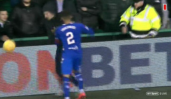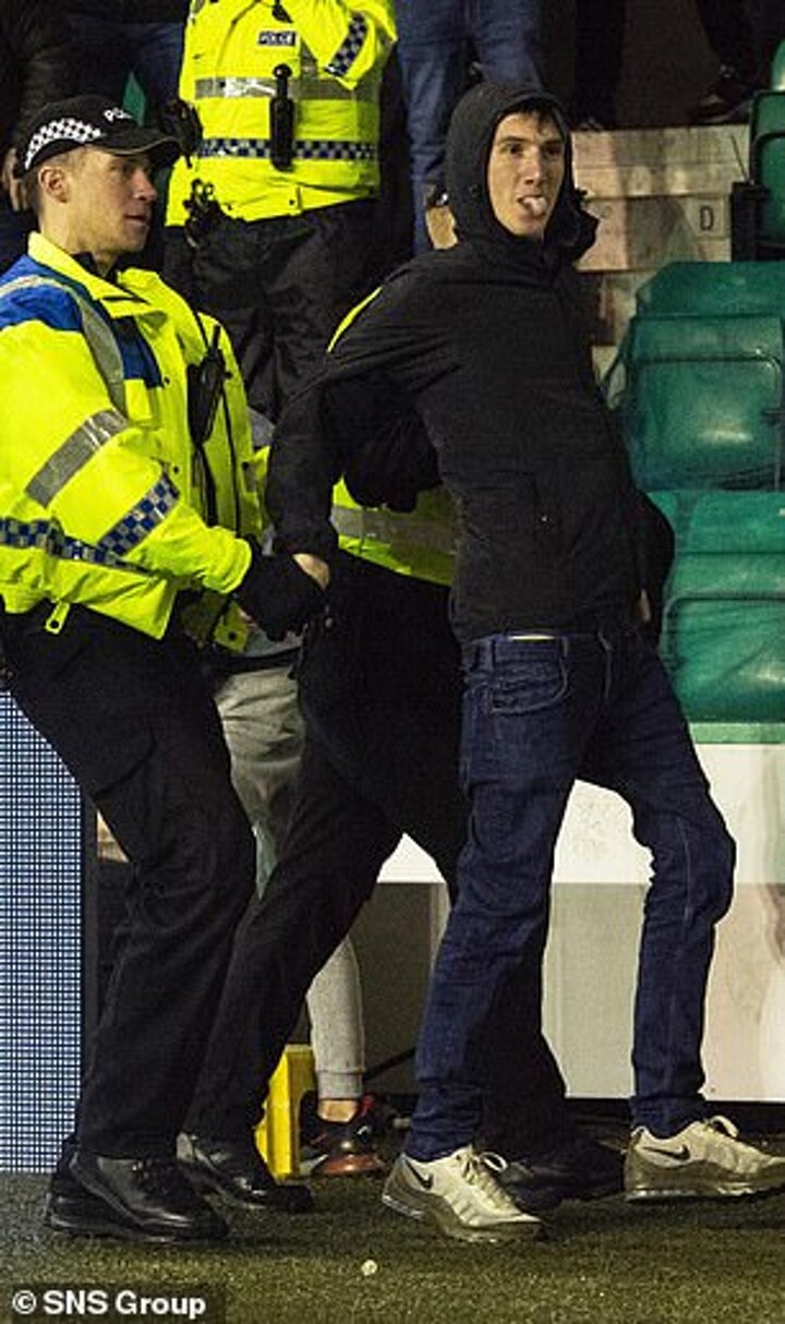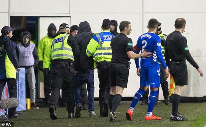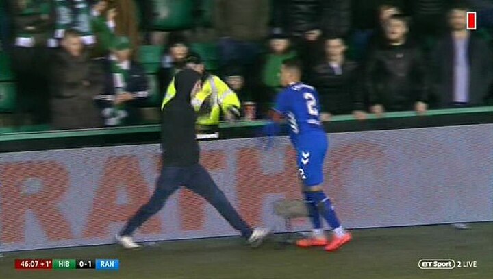 A fan from the home end at Easter Road jumped the hoardings and booted the ball away from James Tavernier as the Rangers captain was about to take a throw.