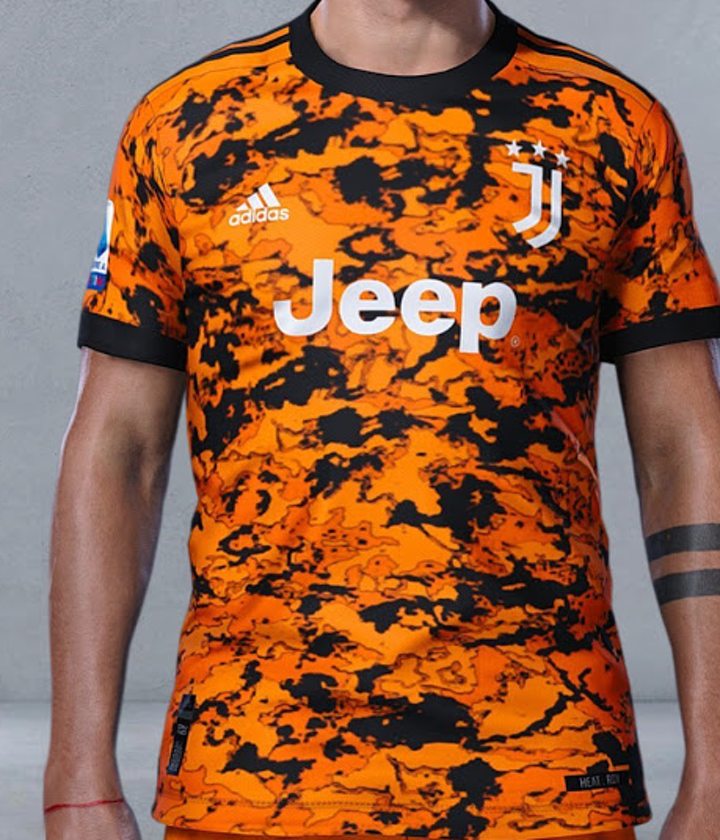 The new Juventus 2020-21 third shirt boasts a striking design in orange and black. It has a contrasting black graphic design on the front.