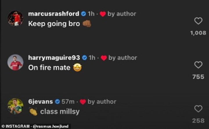Commenting on Hojlund's celebration post on Instagram following the weekend win at Luton, Northern Irishman, Evans, commented: 'class Millsy' alongside a clapping emoji.