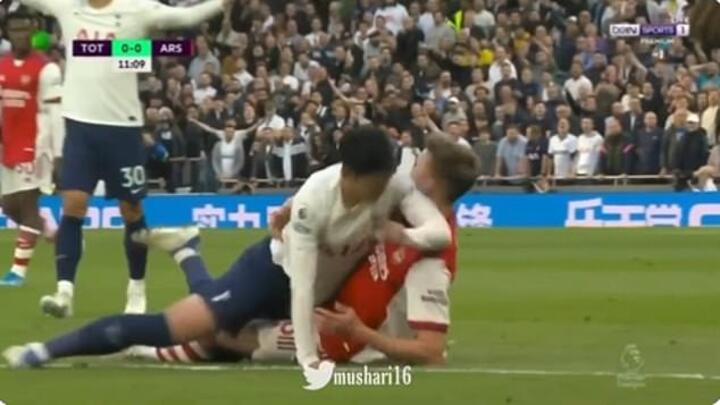 Son and Holding were involved in an individual battle from the outset, and one of their first challenges saw the Arsenal defender haul the forward to the floor. Holding continued to grab onto Son, leading to the Spurs man throwing an arm out in frustration which appeared to clip his opponent on the side of the face.
