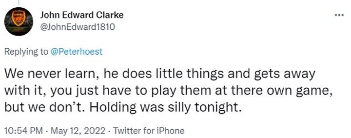 'We never learn, he does little things and gets away with it, you just have to play them at there [sic] own game, but we don’t. Holding was silly tonight,' they added on Twitter.