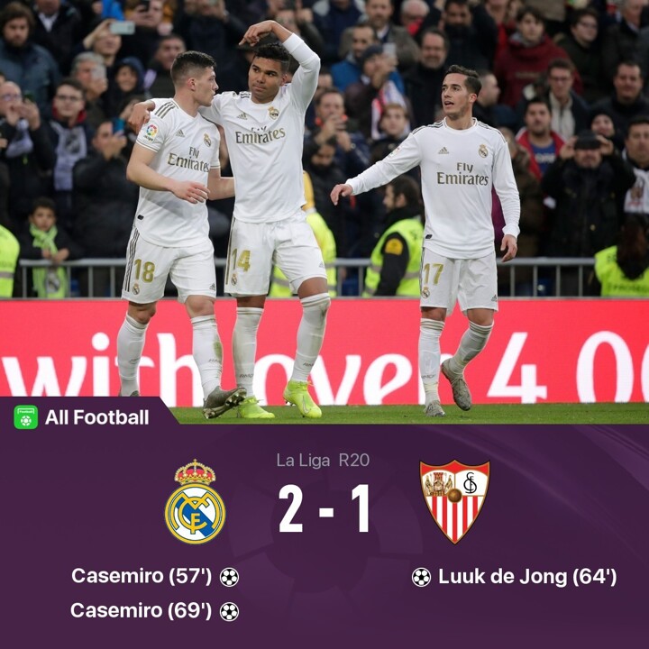 Pour le compte de la 20e journée de Liga, le Real Madrid recevait le Séville FC pour le choc du jour en Espagne. Au Stade Santiago Bernabeu, les Merengues ont eu le dernier mot contre les Andalous (2-1) grâce à un doublé de Casemiro.