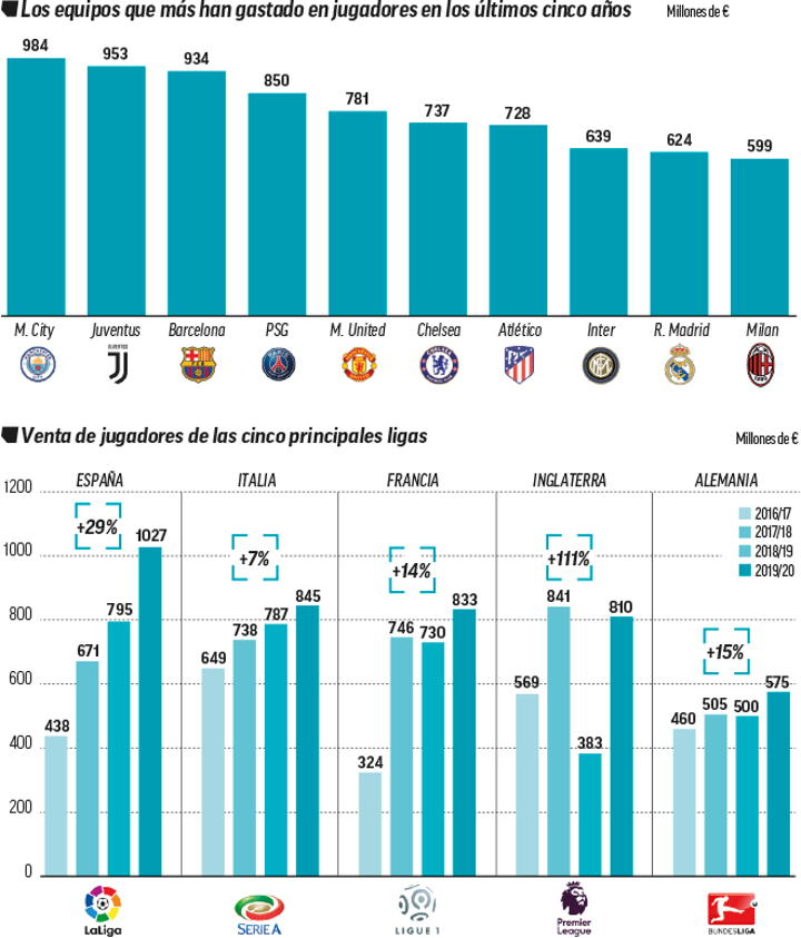 Both LaLiga Santander (1.319 billion euros spent) and Serie A (1.178 billion euros) broke their spending records this summer.