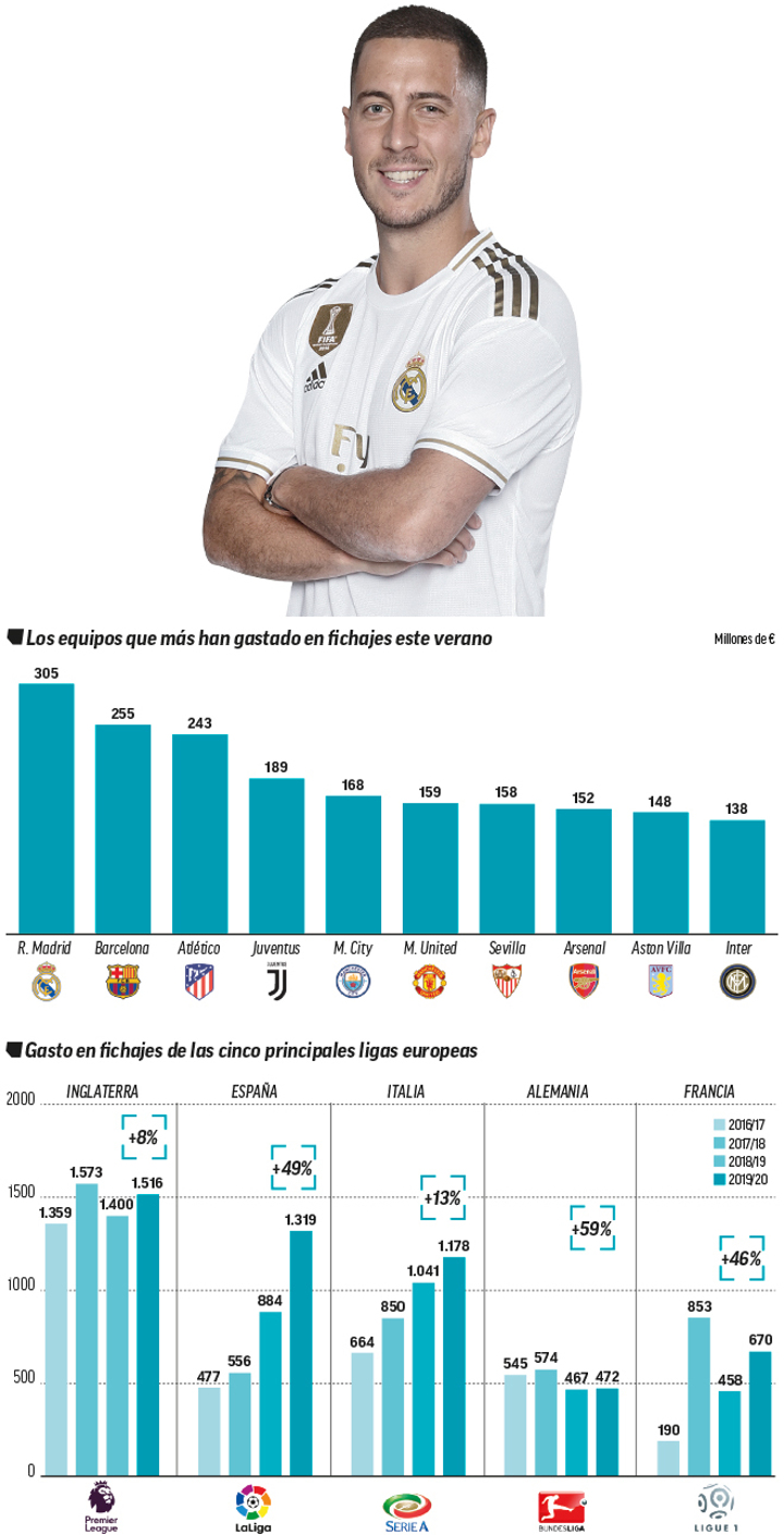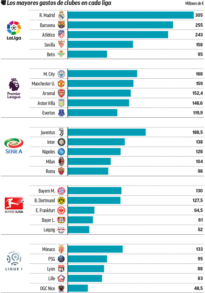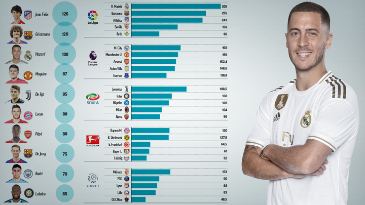 LaLiga Santander, Serie A, and the Bundesliga all made huge strides in closing the gap at the top. LaLiga Santander was boosted by the signings of Joao Felix (126 million euros to Atletico), Antoine Griezmann (120 million euros to Barcelona) and Eden Hazard (100 million euros to Real Madrid).