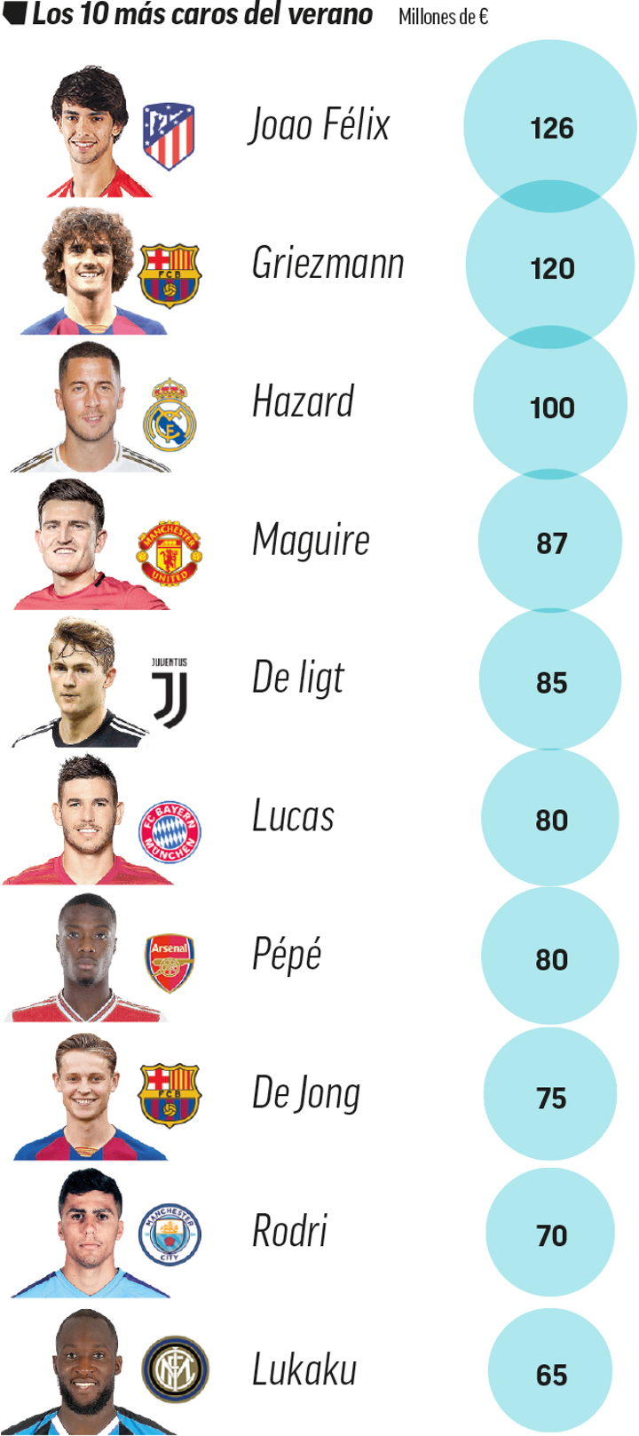 Premier League clubs were still the biggest spenders in Europe thanks to the signings of Harry Maguire (87 million euros to Manchester United), Nicolas Pepe (80 million euros to Arsenal) and Rodri (70 million euros to Manchester City).
