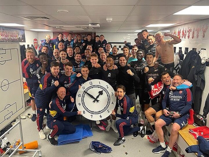 After the game, a photo of the Gunners players holding a replica of the iconic clock that is positioned above the Clock End at the Emirates Stadium in the away dressing room at Craven Cottage emerged.