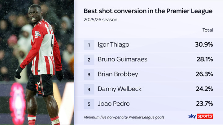 But Deadline Day signing Brian Brobbey is now the key focal point up front. And his efficient finishing up front puts him among the best shot converters in the top-flight this season.