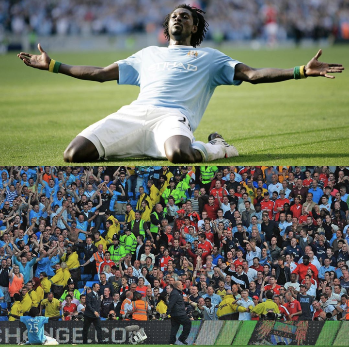 Today marks a DECADE since Adebayor scored against Arsenal in a 4-2 victory for Manchester City and produced THAT celebration!