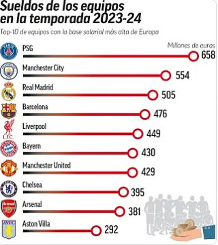 PSG top the list after the French champions paid their players a combined total of €658m (£553m), while LaLiga giants Real Madrid (£424m) and Barcelona (£400m) also feature in the top four.