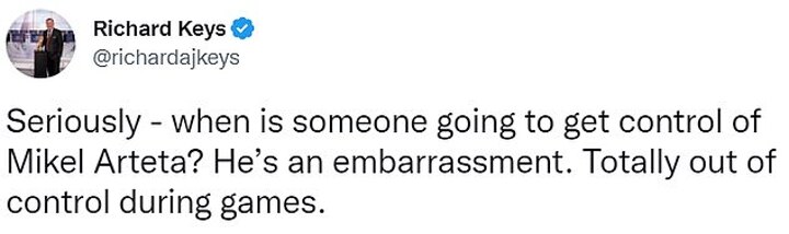 Keys, who is no stranger to having a pop at Arteta, tweeted: 'Seriously - when is someone going to get control of Mikel Arteta? He’s an embarrassment. Totally out of control during games.'