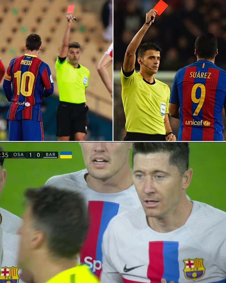 Referee Jesús Gil Manzano has issued red cards to Messi, Suarez and Lewandowski in his career.
