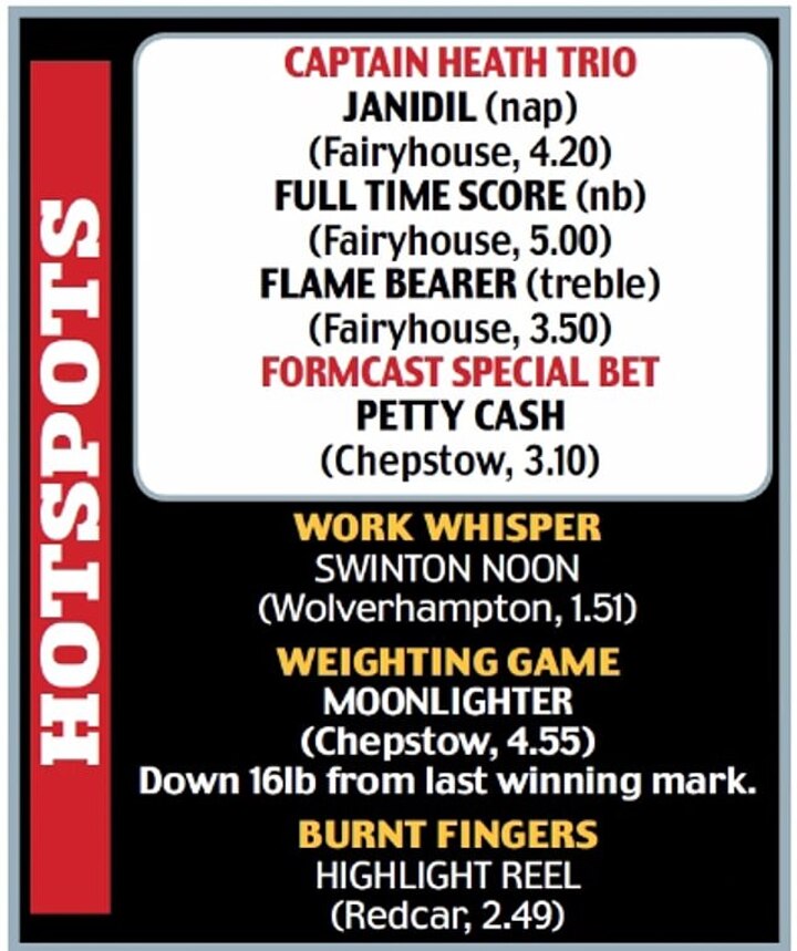 With that in mind, the hardy MISTER FOGPATCHES (Fairyhouse, nap, 5.00) could be nicely weighted towards the foot of the handicap and I am hopeful the first-time cheekpieces will produce improvement from a horse that was placed in last year’s Scottish National.