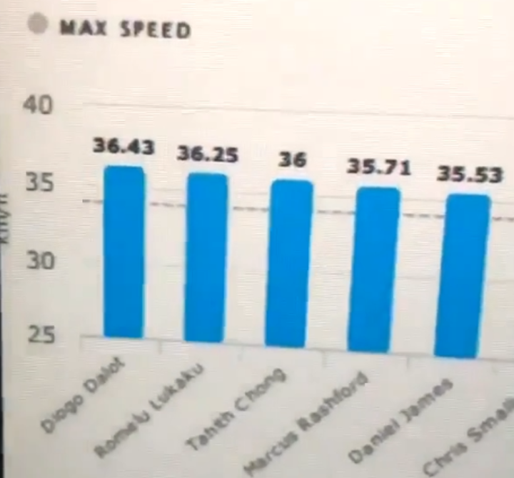 The data shows Lukaku as the second fastest player in that particular session, registering a top speed of 36.25 km/h, with only Diogo Dalot clocking up a quicker speed at 36.43.