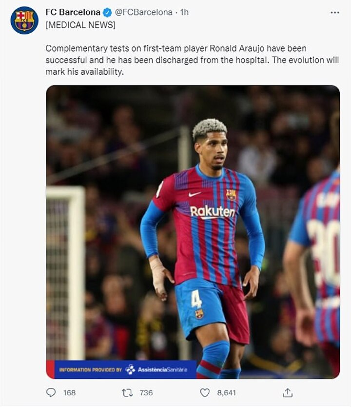 Barcelona tweeted the good news, saying: 'Complementary tests on first-team player Ronald Araujo have been successful and he has been discharged from the hospital.