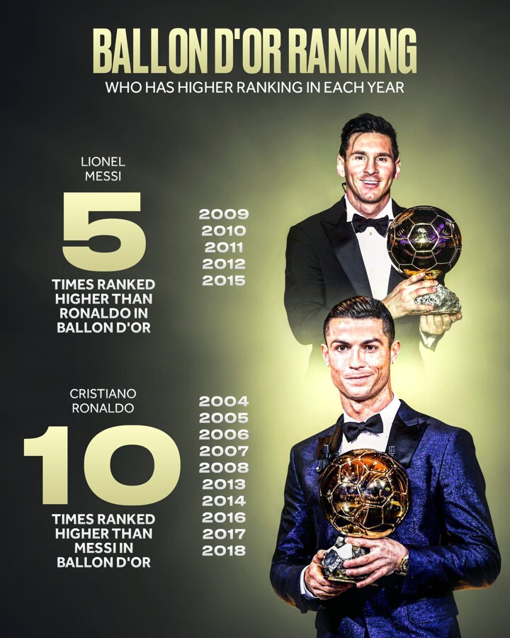Ronaldo has been ranked above Messi in Ballon d'Or for 10 times while Leo is higher for 5 times. Copyright Declaration