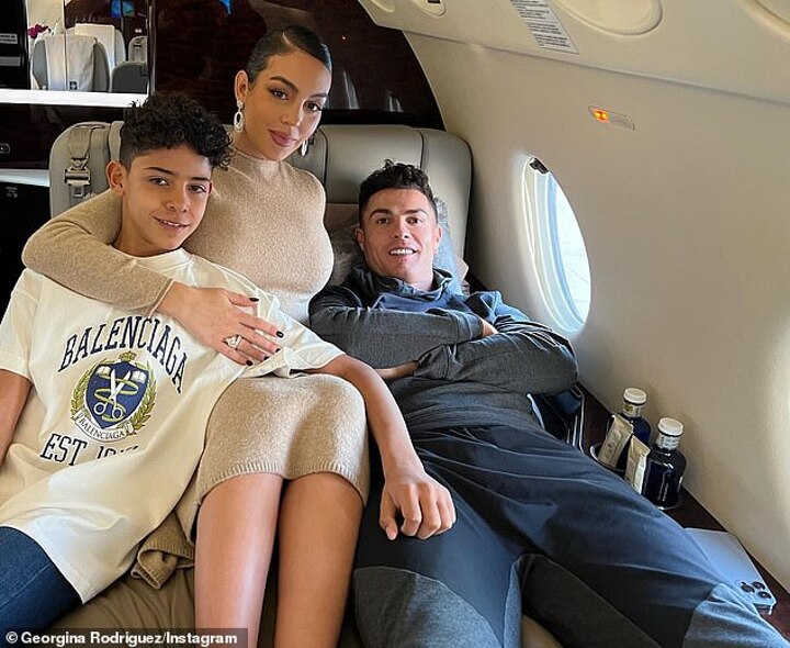 Taking to Instagram during the flight home, pregnant Georgina - who will give birth to twins later this year - shared images of herself alongside the sporting icon as they relaxed in their private seating area.