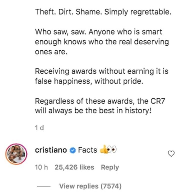 The bizarre Instagram post went on to describe Messi's 'shame' in accepting the award he didn't earn was there for all to see before Ronaldo made the 'facts' statement with a thumbs up and looking eyes emoji directly underneath.
