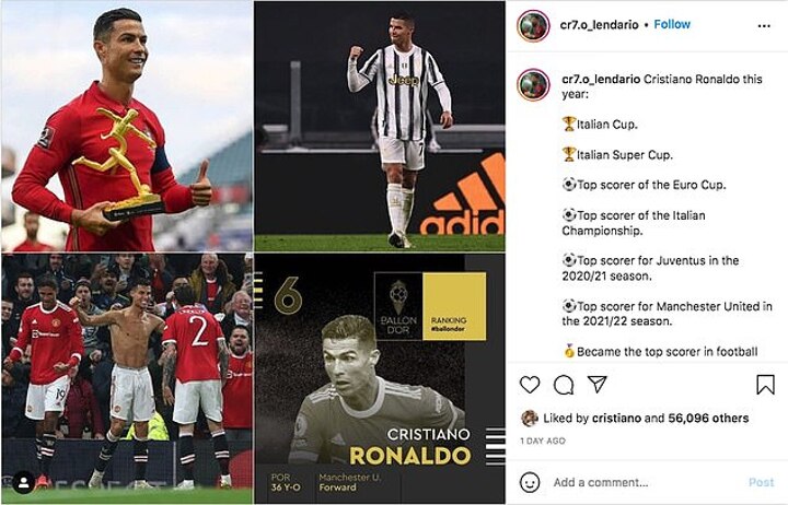 The post, on the page of a fan account called 'Cristiano Ronaldo - The Legendary' which Ronaldo himself follows, detailed Ronaldo's 2021 achievements before describing Messi's accolade as 'Theft. Dirt. Shame. Simply regrettable.'