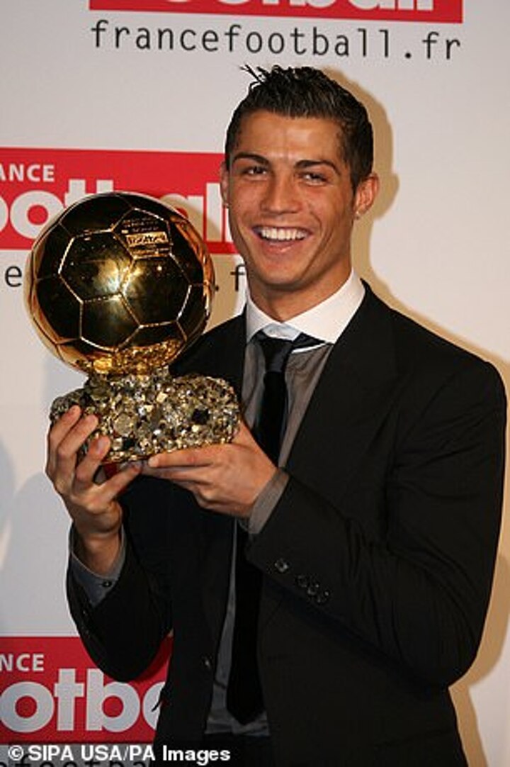Following a stunning season with Manchester United that saw him score an incredible 42 goals in 49 games, Ronaldo was awarded his first Ballon d'Or trophy, beating Messi and Fernando Torres to the gong.