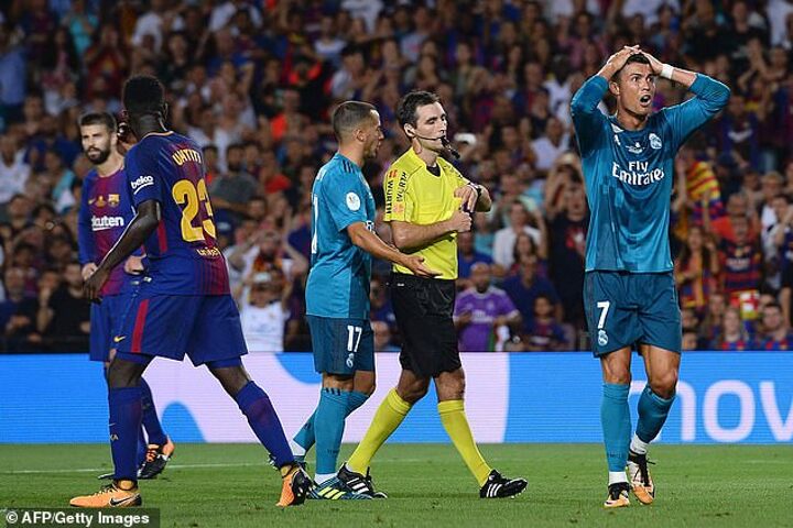 Referee Ricardo de Burgos Bengoetxea took ill to his tumble in the area after battling with Samuel Umtiti for a loose ball and brandished the card just two minutes after Ronaldo had put Madrid in front - and subsequently taken his shirt off to receive his first.