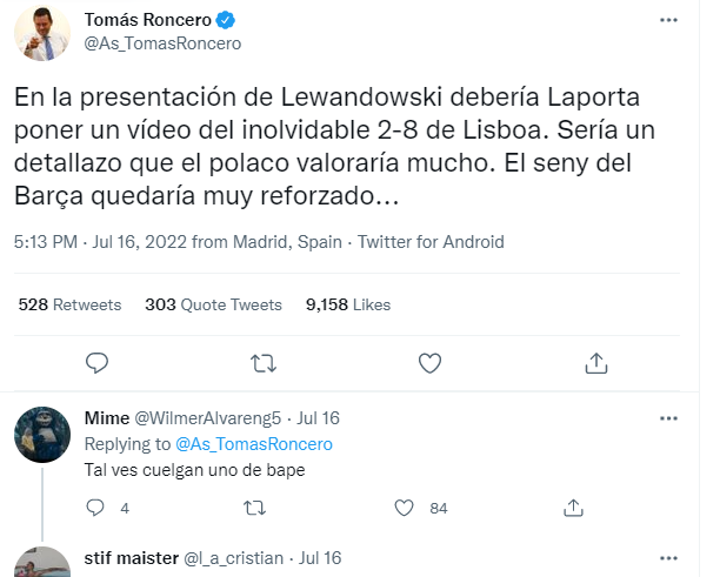 Lewandowski is on the verge of joining Barcelona, according to transfer expert Romano. The editor-in-chief of "Aspen News" and Real Madrid fan Tomás Roncero satirized Barcelona on his personal social media.