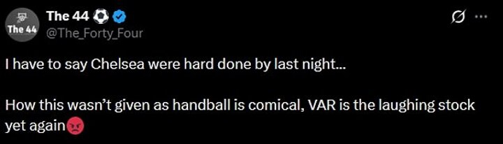 Another posted: 'I have to say Chelsea were hard done by last night. How this wasn't given as a handball is comical, VAR is the laughing stock yet again.'
