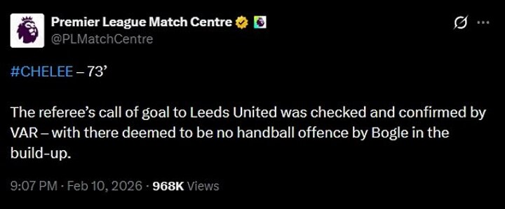 Shortly after Okafor's controversial equaliser was awarded, the Premier League Match Centre posted on social media: 'The referee's call of goal to Leeds United was checked and confirmed by VAR - with there deemed to be no handball offence by Bogle in the build-up.'