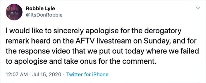 He wrote: 'I would like to sincerely apologise for the derogatory remark heard on the AFTV livestream on Sunday, and for the response video that we put out today where we failed to apologise and take onus for the comment.