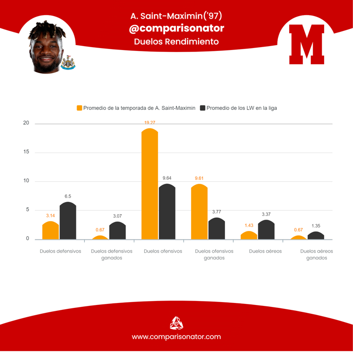 Duels performance of Saint-Maximin vs. other Premiership left wingers. Source: Comparisonator.