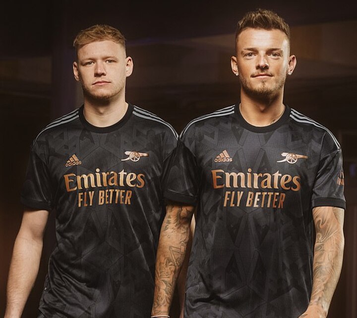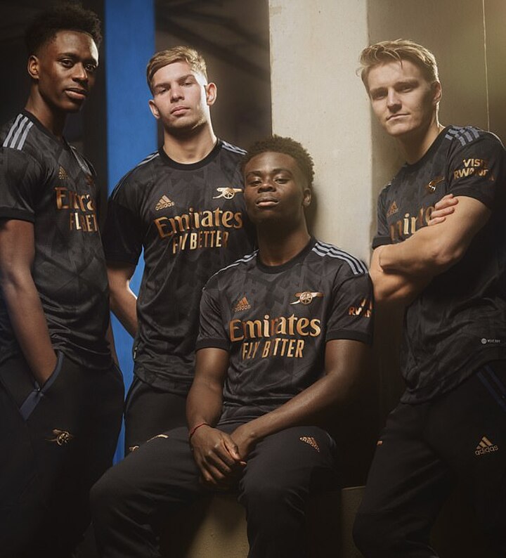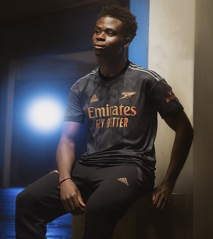 Bukayo Saka led the list of Arsenal players who unveiled the club's slick new black and bronze away kit for the new season.