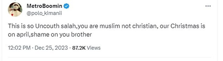 Another supporter wrote: 'This is so uncouth Salah, you are Muslim not Christian. Our Christmas is on April, shame on you brother.'