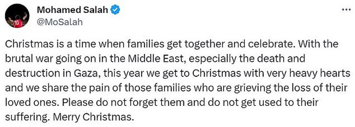 Salah, who is Muslim, posted a photo of a Christmas tree and included a caption in which he talks about the conflict involving Israel and Palestine, before wishing his followers a 'Merry Christmas'.