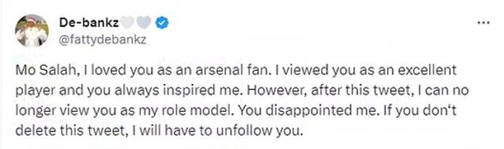 Somebody claiming to be an Arsenal supporter wrote: 'Mo Salah, I loved you as an Arsenal fan. I viewed you as an excellent player and you always inspired me.