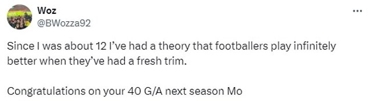 A fourth fan wrote: 'Since I was about 12 I’ve had a theory that footballers play infinitely better when they’ve had a fresh trim. Congratulations on your 40 G/A next season Mo'