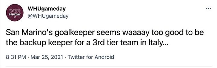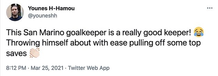 'This San Marino goalkeeper is a really good keeper! Throwing himself about with ease pulling off some top saves,' said one fan.