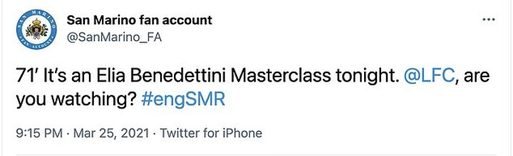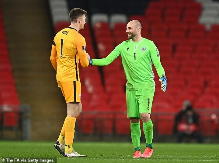 San Marino goalkeeper Elia Benedettini has been hailed by fans for producing a 'masterclass' against England to help keep the score modest in their 5-0 defeat at Wembley on Thursday.