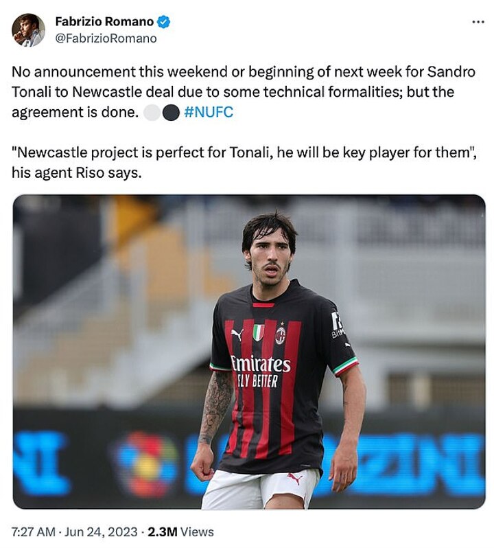 According to Fabrizio Romano, the 'agreement has been done' with the Italian Journalist saying on Twitter: 'No announcement [will come] this weekend or beginning of next week for Sandro Tonali's [transfer] to Newcastle, due to some technical formalities.'