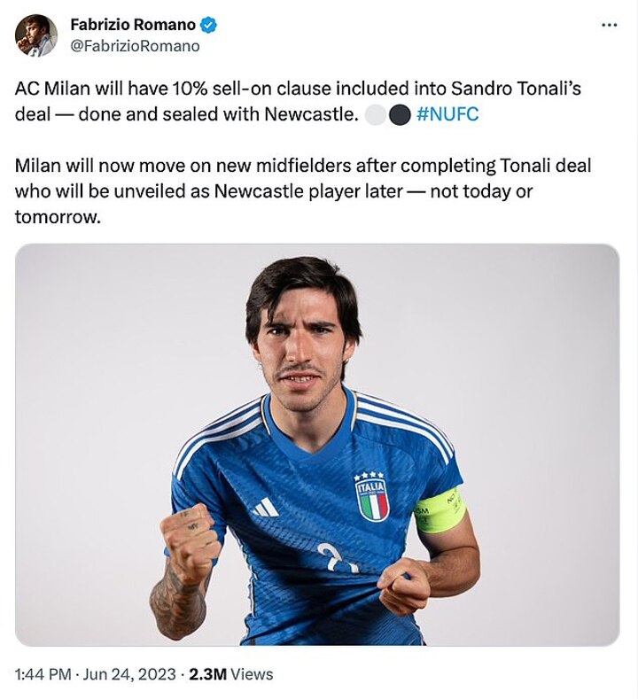 Earlier today, club chairman Yasir Al-Rummyan claimed that he wanted the Magpies to 'be number one' following their remarkable season, and Tonali could help them achieve that, having previously been dubbed as 'the new Pirlo'.