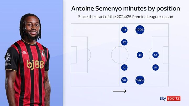 Semenyo is unusual in that he is not only physically imposing for a winger, he is perfectly capable of operating on either flank. His minutes under Cherries boss Andoni Iraola have been shared almost equally between the left wing and the right wing.