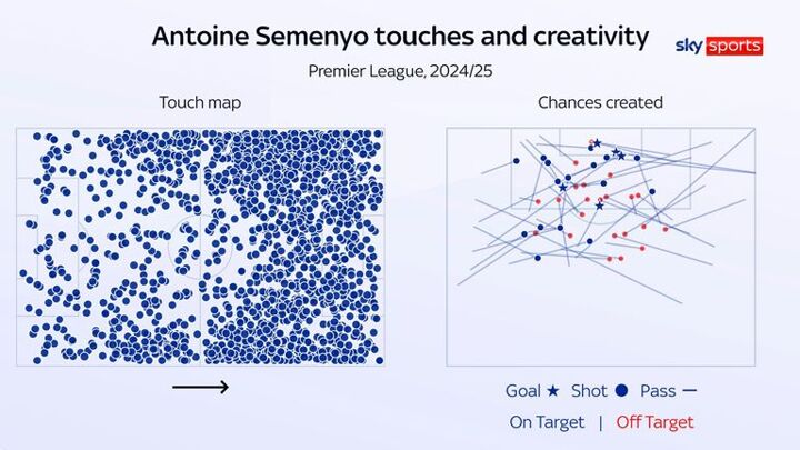 Intriguingly for his coaches, the tactical choice requires no great adaptation for Semenyo himself because he can use either foot. Check out his shot distribution over the past two Premier League seasons - 71 shots with his left and 62 with his right.