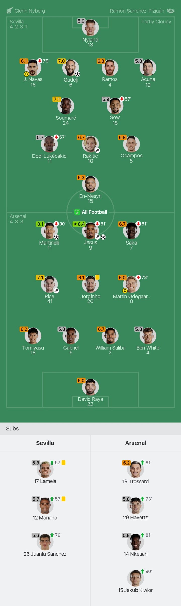 We bring you the player ratings for Sevilla vs Arsenal as Jesus becomes Man of the Match with a rating of 8.4.