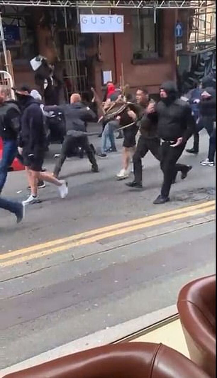 Another video shared online showed the moment a police van arrived to a brawl which had spilled out of the Piccadilly Tavern.