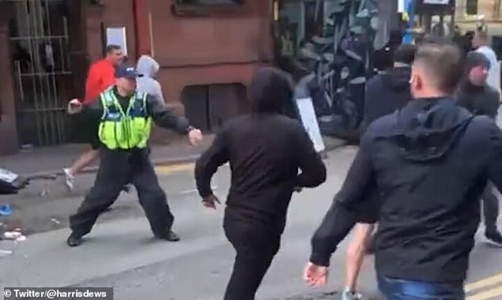 A video posted on Twitter showed fans using bins and chairs as weapons as one lone police officer frantically tried to separate those involved using a baton.