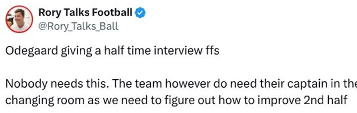A fifth said: 'Odegaard giving a half-time interview ffs. Nobody needs this.
