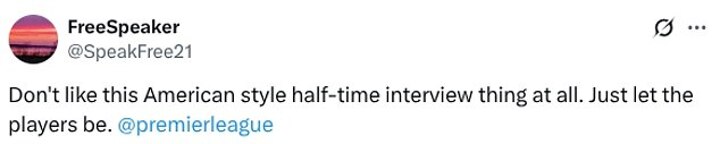 Posting on X, one user said: 'Don't like this American-style half-time interview thing at all. Just let the players be @premierleague.'