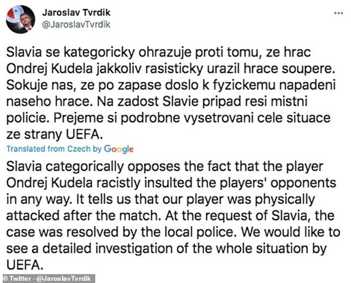 ‘Slavia categorically denies the fact that the player Ondrej Kudela racially (sic) insulted the players' opponents in any way,’ write Tvrdik.