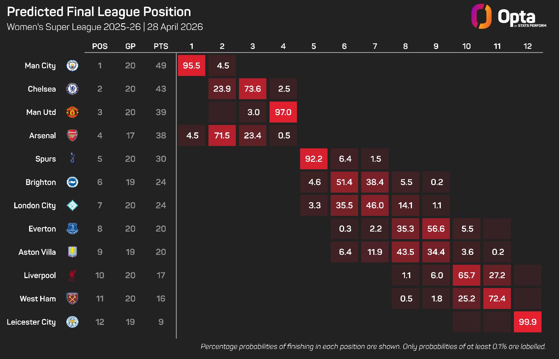 The Opta supercomputer has assigned Arsenal a 4.5% chance of reaching the top of the pile, though their most likely position is second (71.5%) in its season simulations with City the overwhelming favourites at 95.5%.