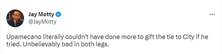 There was a running theme in some comments, as one user said: 'Upamecano literally couldn't have done more to gift the tie to City if he tried. Unbelievably bad in both legs.'